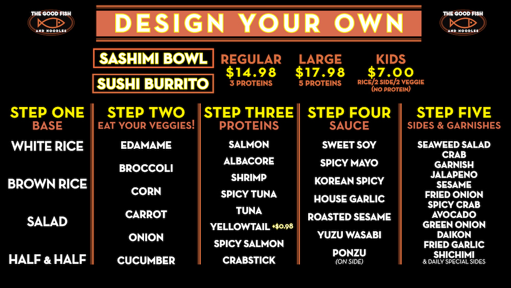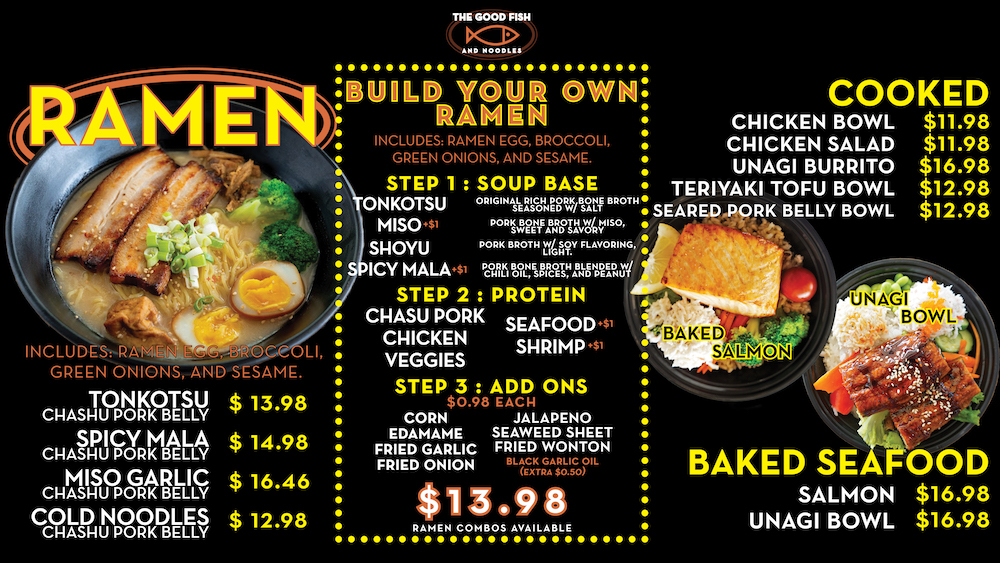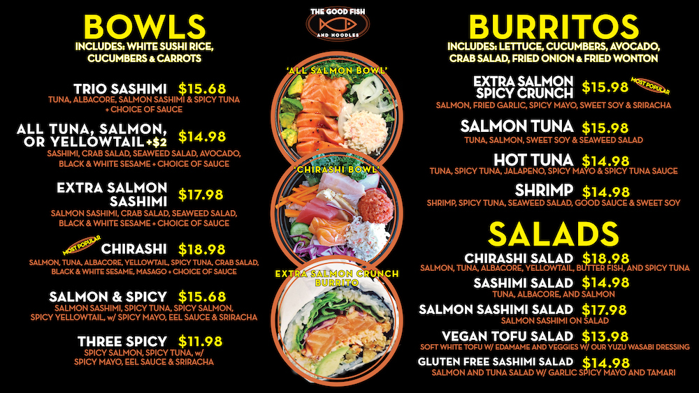 Welcome to The Good Fish And Noodles, a culinary gem located in Fullerton, CA, where the essence of fresh seafood meets the comfort of hearty noodles. Their menu offers an exquisite range of bowls and salads that will elevate your dining experience. Indulge in the Trio Sashimi Bowl featuring tuna, albacore, and salmon sashimi or savor the delightful Chirashi Bowl, showcasing a colorful assortment of fresh fish paired with vibrant crab salad and a choice of sauce.